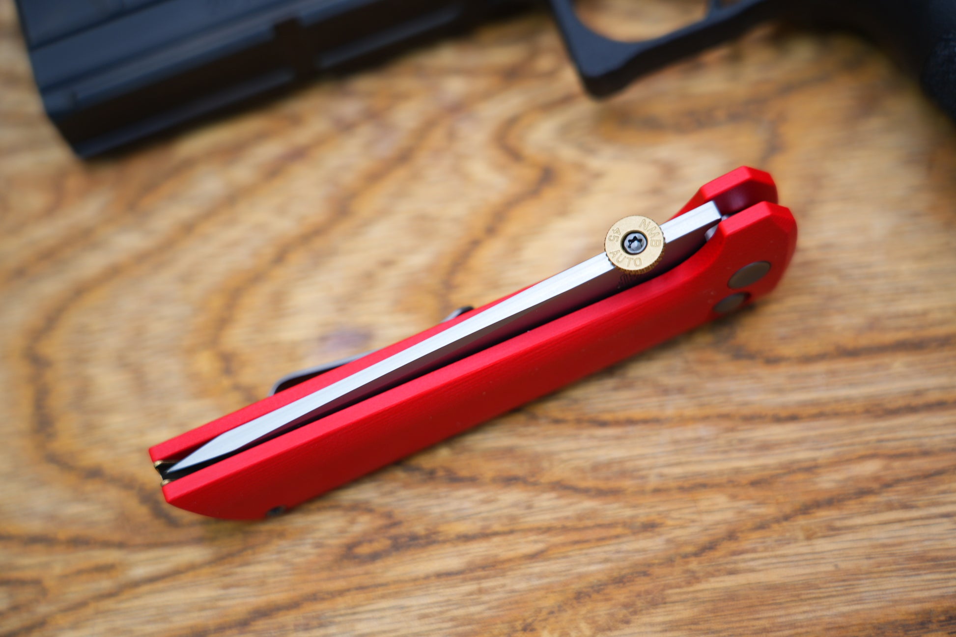 Custom Thumb Disc Modeled After a .45 ACP Casing – CNC-machined, slightly smaller than a real .45 round, and non-functional, but designed for a bold tactical look. This feature allows for smooth one-handed deployment – left-handed friendly, too.