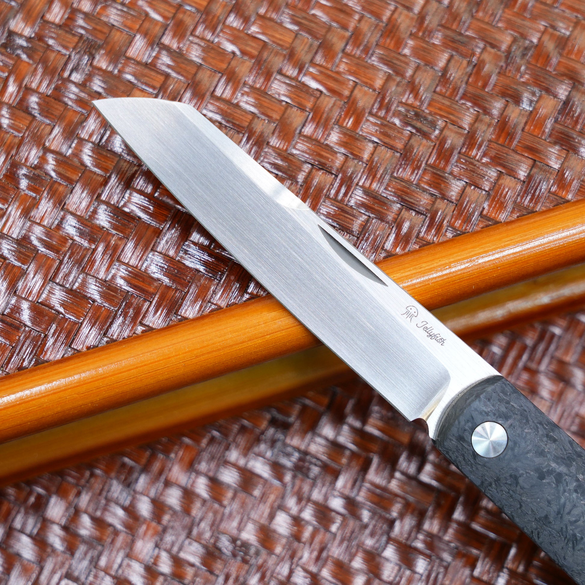 Production test Pocket knife with non-locking design, carbon fiber handle, M390, handmade satin finish.