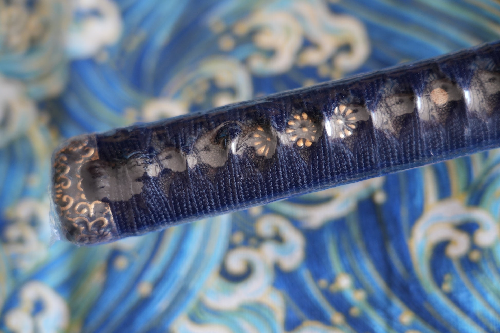 Habaki & Tsuba: Features a stunning honeycomb-patterned Habaki and a classically designed Tsuba with intricate floral motifs.