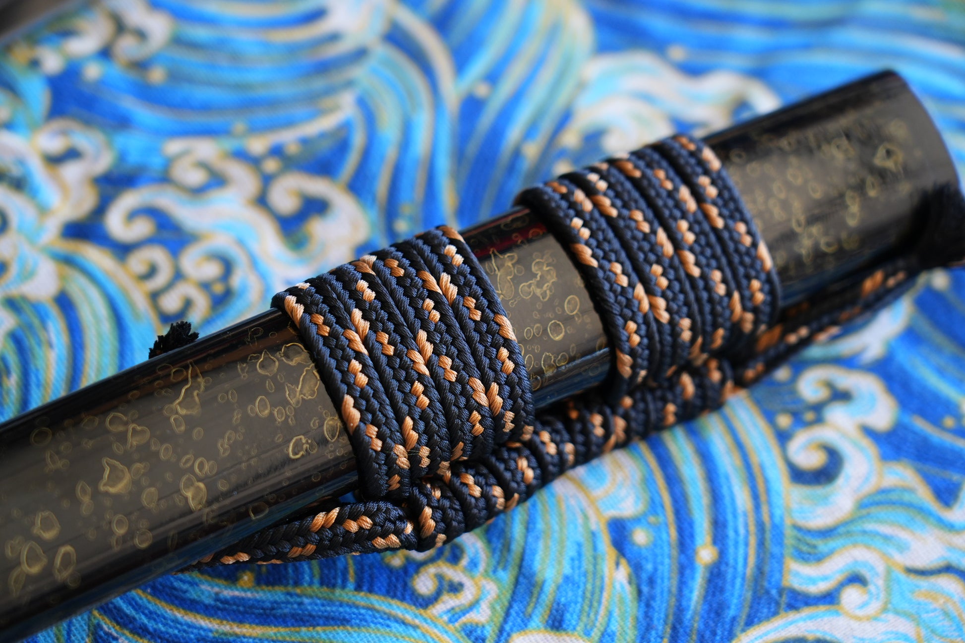 The Saya (Scabbard): A deep obsidian black lacquer finish adorned with unique gold-flecked "cloud" patterns, making this piece a standout display item.